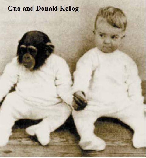 Akan tetapi N.Ladigina melakukannya  tanpa  kehadiran  anak-manusia, jadi Kellog berharap,  bahwa dengan mendidik bersama-sama dengan putranya,  akan membuahkan hasil yang berbeda.  Apalagi, bukankah di usia satu tahun, chimpanse tersebut sudah terlambat untuk pendidikan ulang. Gua – diterima dalam keluarga itu, dan ia dididik serupa seperti terhadap Donald. Mereka bergaul cocok satu dengan lainnya, dan dalam waktu singkat menjadi tidak terpisahkan. Para pelaku-eksperiment tersebut mencatat setiap rinci: Donald menyukai bau minyak-wangi, sedangkan Gua: tidak. Dilakukan percobaan,siapa yang lebih cepat menebak  bagaimana dengan tongkat menggapai  biskuit,yang digantung dengan  benang di-langit2 ditengah ruangan ? Pula, kalau dengan mata ditutup dan dipanggil nama2 mereka, siapa yang  lebih  tepat mengetahui dari  mana arah suara  panggilan?